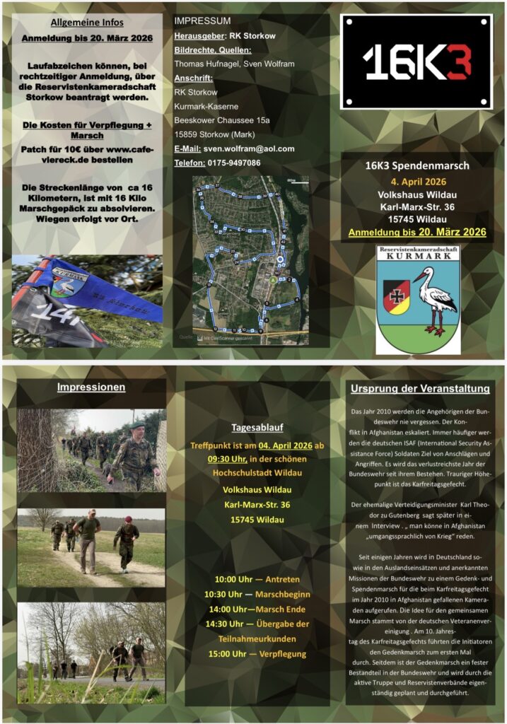 Der Marsch wird deutschlandweit zum sechsten Mal durchgeführt und organisiert in Wildau von der Reservistenkameradschaft Kurmark Storkow. Die Teilnehmenden werden größtenteils Uniformen tragen, wofür sie die Erlaubnis haben.