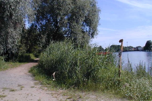 Ein schmaler Weg führt nun direkt am Ufer der Dahme entlang, über den Deich, bis hin zu einer kleinen Bucht am Standort der Werft. Wenn die Füße einen im Stich lassen und nicht weiter laufen wollen, kann man an dieser Stelle eine Abkürzung nehmen und über den Schwarzen Weg auf der rechten Seite schneller zurück zum Ausgangspunkt gelangen. Dafür geht man einfach den Schwarzen Weg entlang, bis zu einer Wegabzweigung, die zurück auf die Karl-Marx-Straße führt. Dort läuft man solange geradeaus, bis man wieder am Marktplatz angelangt ist.